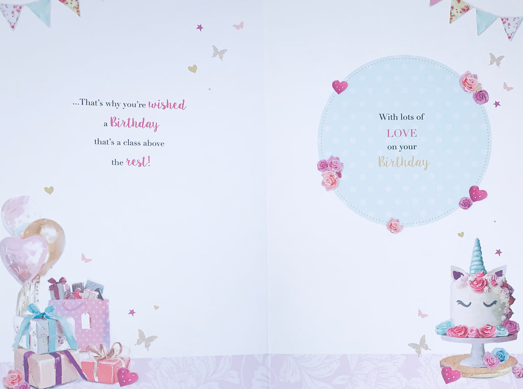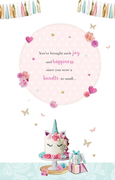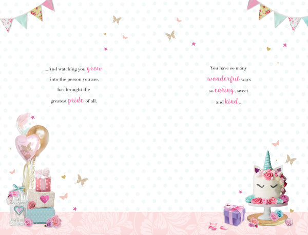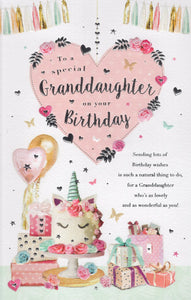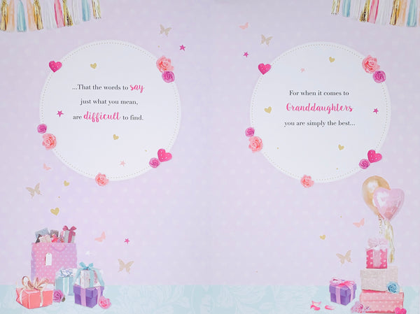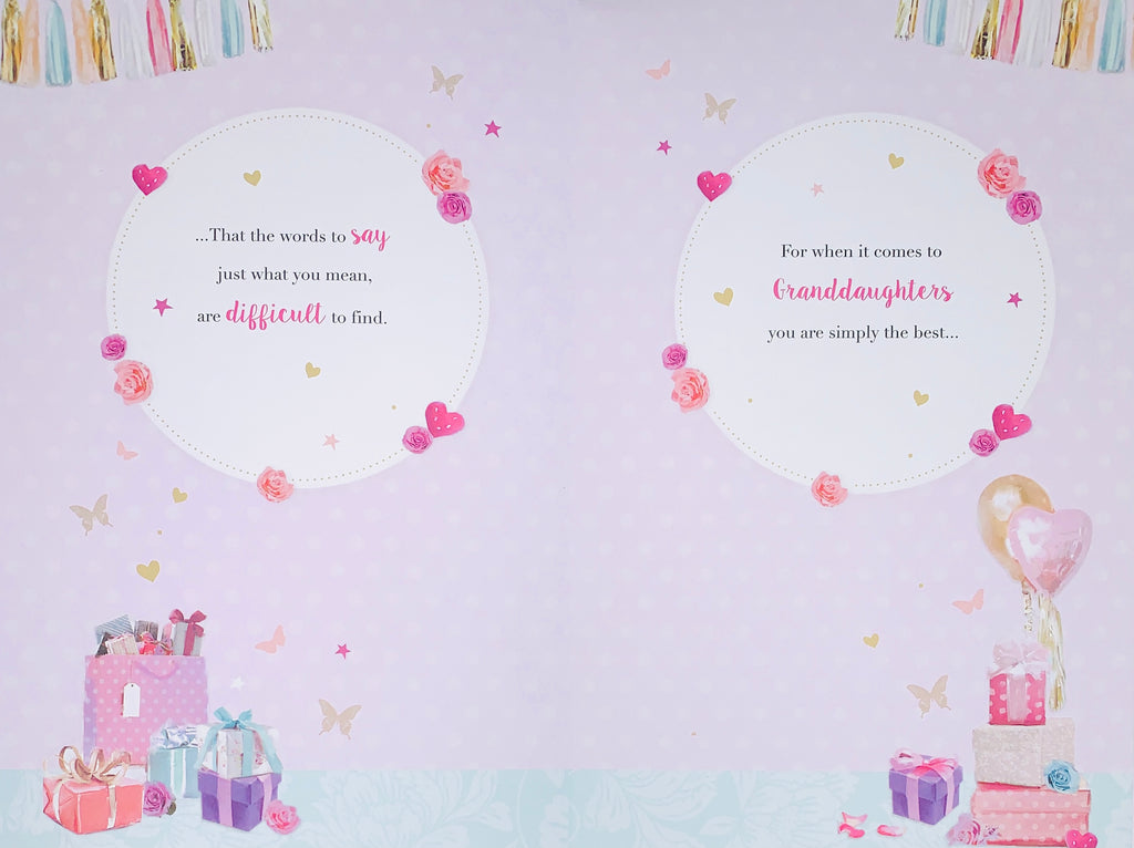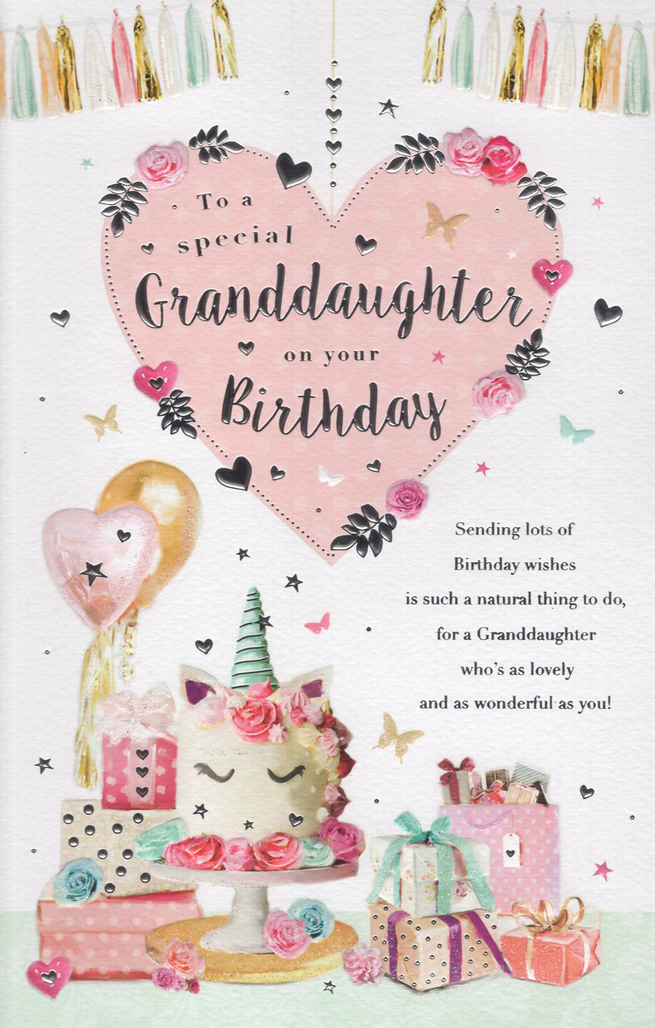 Send your granddaughter a delightful and heartfelt birthday greeting with this special granddaughter birthday card. This design is printed on high-grade board with a gorgeous silver foil finish and includes a colorful, multi-page insert featuring a heartfelt verse.