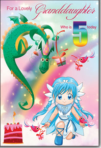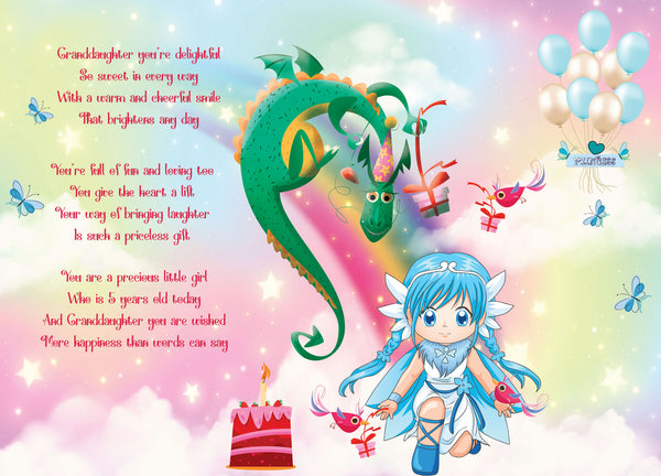 Send your loving birthday wishes to your Granddaughter with this cute Granddaughter 5th birthday card. This age 5 granddaughter birthday card features a cute rainbow princess and dragon design. This greeting card is printed on high quality board with a glitter finish and full colour print inside. This Granddaughter 5th birthday card is designed and printed in the UK.