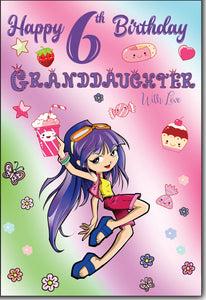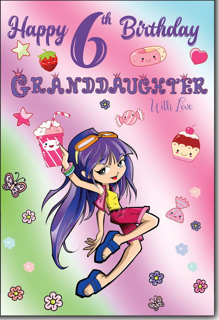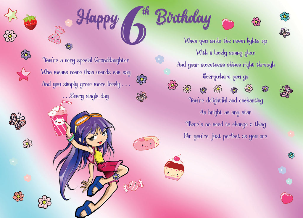 Wish your Granddaughter a lovely fun filled birthday with this granddaughter sixth birthday card. This granddaughter age 6 birthday card features a fun and colourful design. This greeting card is printed on high quality board with a glitter finish and full colour print inside.