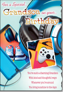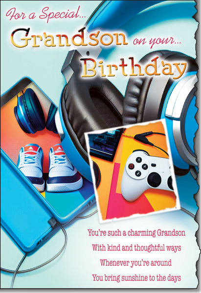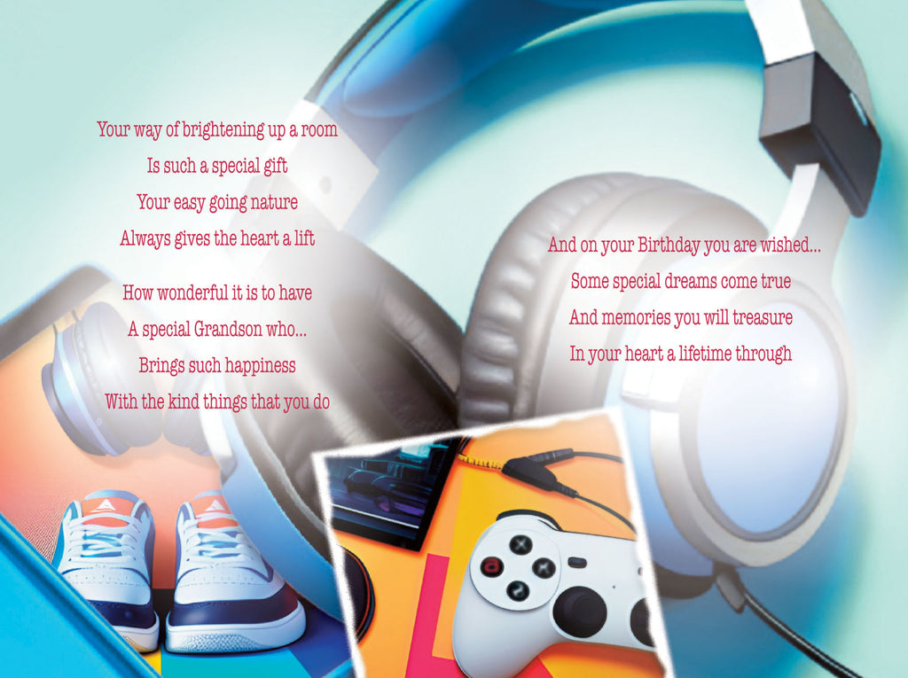 Wish your Grandson a wonderful birthday with this special Grandson birthday card. This Grandson birthday card features a music themed photographic design. This Grandson birthday card is printed on high quality board with a glitter finish and full colour insert. Long verse. This Grandson birthday card is designed and printed in the UK.