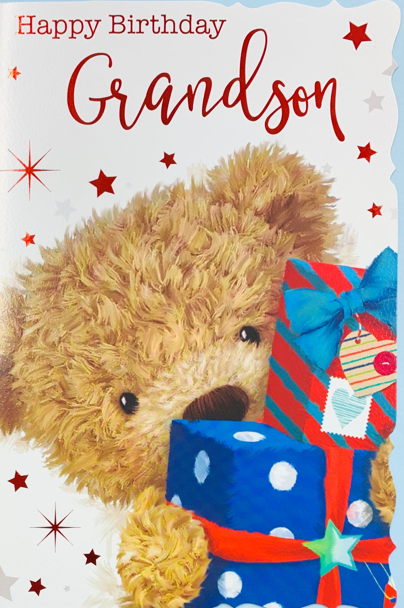 Wish your Grandson a wonderful birthday with this cute Grandson birthday card. This cute Grandson birthday card features a cute teddy bear design. This greeting card has a hot foil finish and full colour insert.