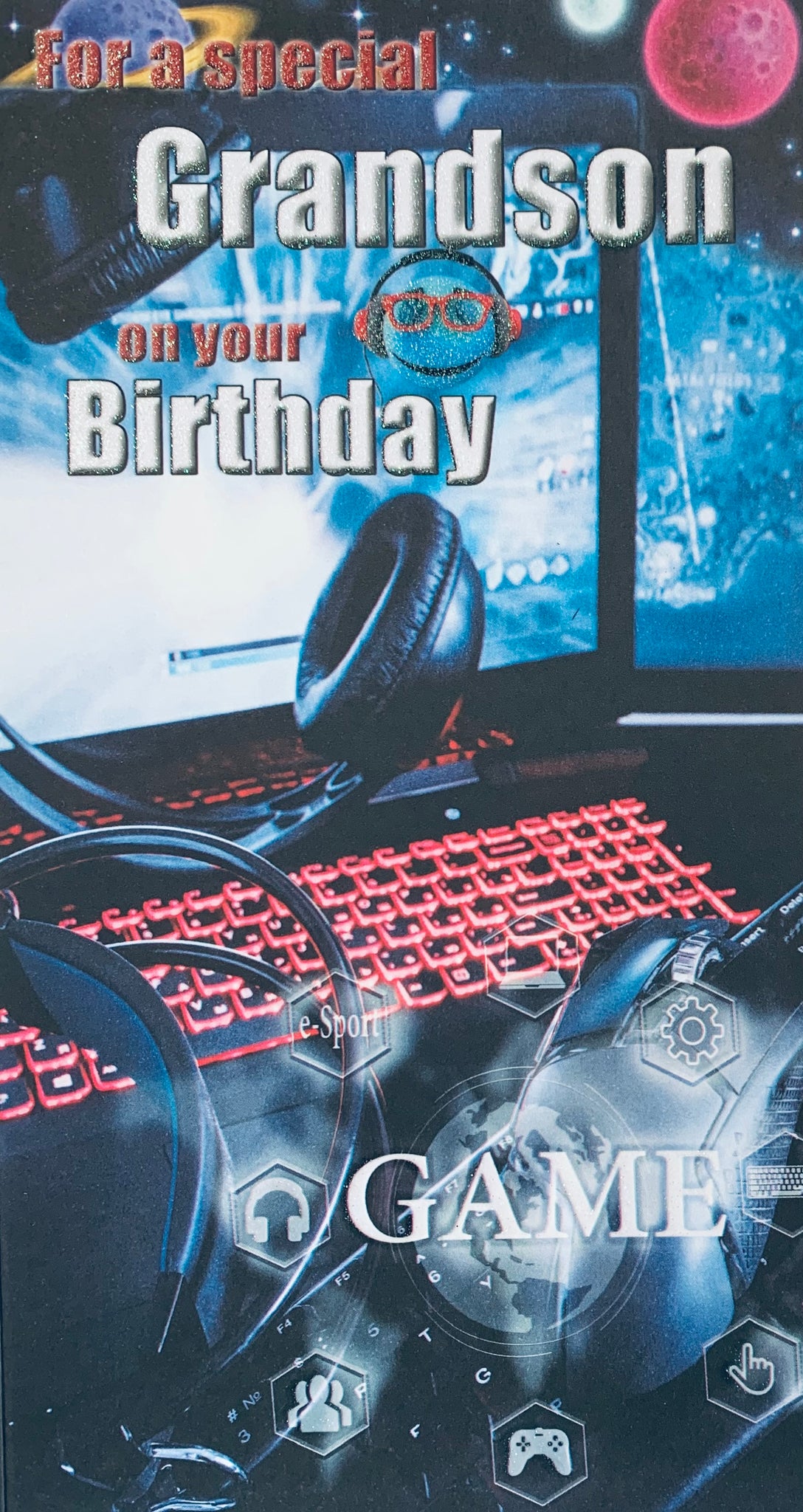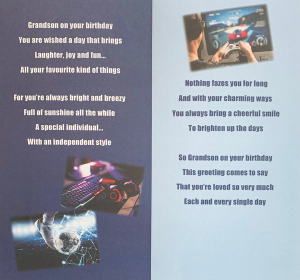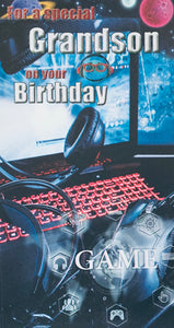 Let your Grandson know how special he is with this lovely Grandson birthday card. This Grandson birthday card features a photographic gamer design and is printed on high quality board with glitter finish. Gamer enthusiasts theme. This greeting card has a full colour insert and a long sentimental verse. This greeting card is designed and printed in the UK.
