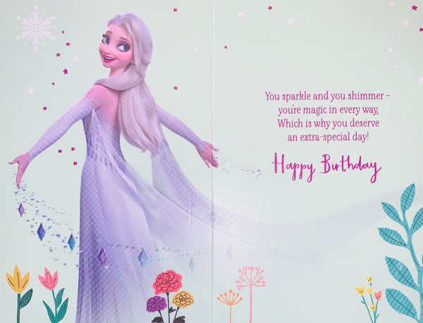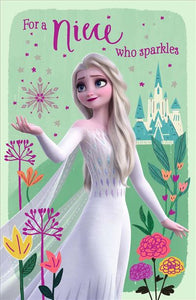 Send magical bday cheer to your favorite Niece with this beautiful Disney Frozen-themed card! It's printed on high-quality board with shiny hot pink hot foil, and is sure to wow with its full-color interior and eco-friendly materials.