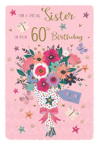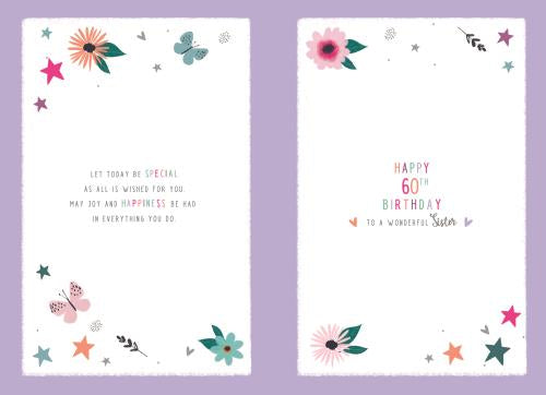celebrate your Sister’s 60th birthday with this Sister 60th birthday card. This Sister sixtieth birthday card features a colourful floral design. This greeting card is printed on high quality board with bright golden foil finish with a full colour insert. This 60th birthday card for Sister is designed and printed in the UK.