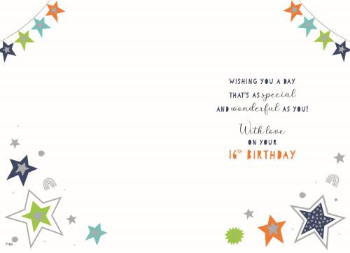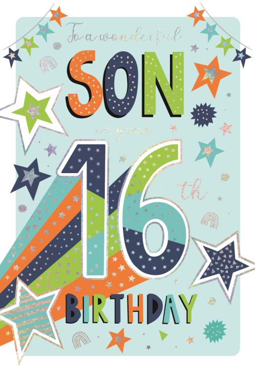 celebrate your Son’s 16th birthday with this Son 16th birthday card. This Son 16th birthday card features a colourful birthday star design. This greeting card is printed on high quality board with blue foil finish and a full colour insert. This 16th birthday card for son is designed and printed in the UK.