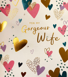 Make your Wife’s birthday special with this lovely Wife birthday card. This Wife birthday card has been printed on high quality board with hot foil finish and multiple decorative attachments. This Wife birthday card shows a modern heart and jewel design with a full colour insert. Short verse.