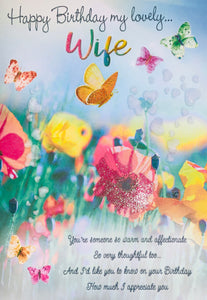 Send your loving birthday wishes to your wife with this beautiful wife birthday card. This wife, birthday card features, a colourful traditional floral design  and is printed on high quality board. This greeting card has a glitter  finish and full colour insert. 3D Pop out butterfly design. Long verse.