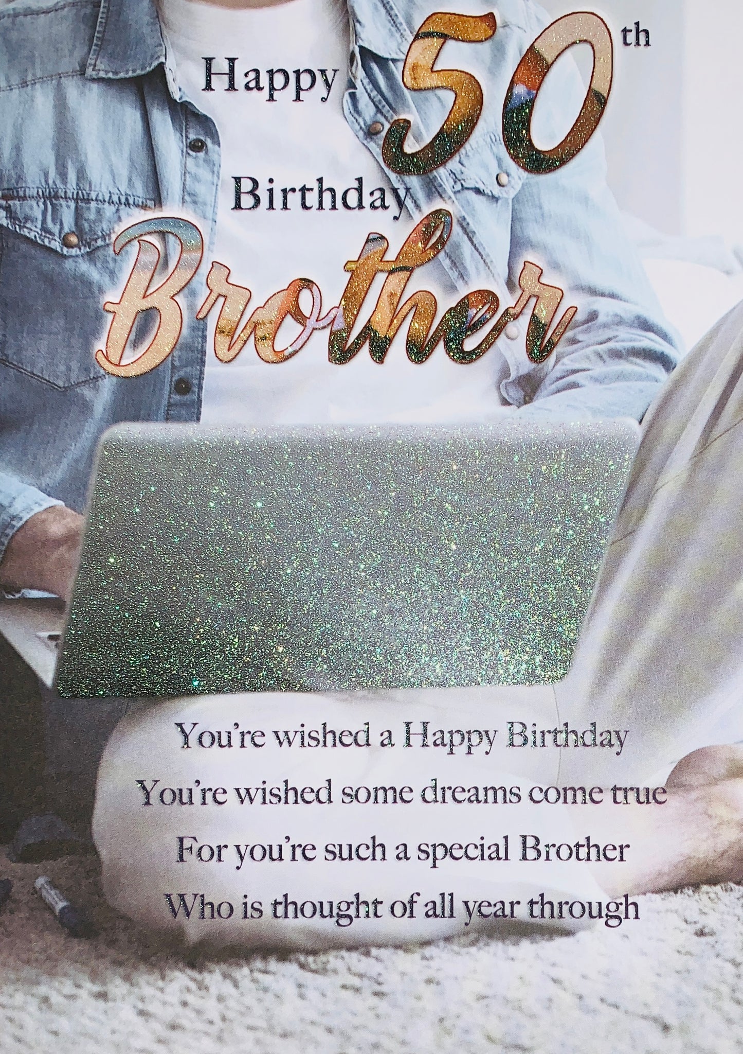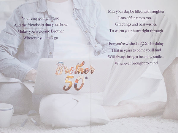 Your easy going nature And the friendship that you show Makes you welcome Brother Wherever you may go Brother 50 May your day be filled with laughter Lots of fun times too... Greetings and best wishes To warm your heart right through For you're wished a 50th birthday That in years to come you'll find Will always bring a beaming smile... Whenever brought to mind