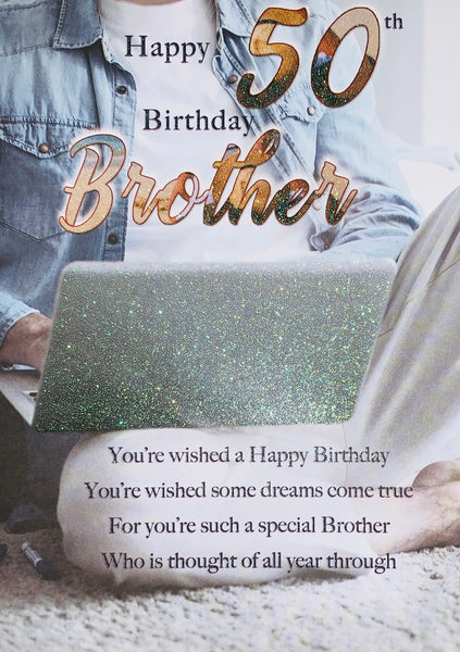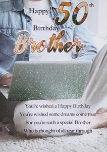 Wish your Brother a special 50th birthday wish with this sentimental Brother 50th birthday card. This Brother fiftieth birthday card features a traditional design. This greeting card is printed on high quality board with glitter finish and full colour insert. This Brother 50th birthday card has a long sentimental verse. This greeting card is designed and printed in the UK