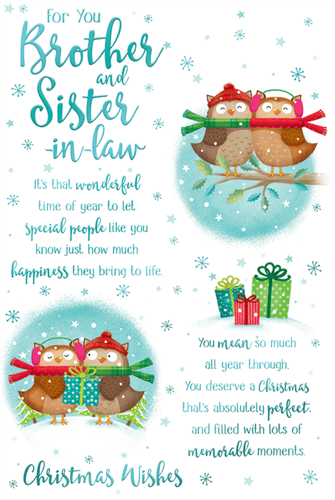 Wish your Brother and Sister-in-law a merry Christmas and let them know they are loved with this cute Brother and Sister-in-law Christmas card. This Brother and Sister-in-law Xmas card features a cute owl design. Inside this Brother and Sister-in-law Christmas card is a full colour insert. This Brother and Sister-in-law Christmas card features a hot foil finish and is designed in the UK.