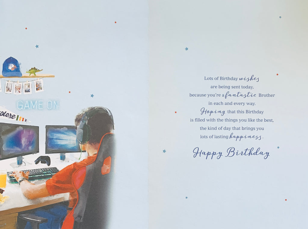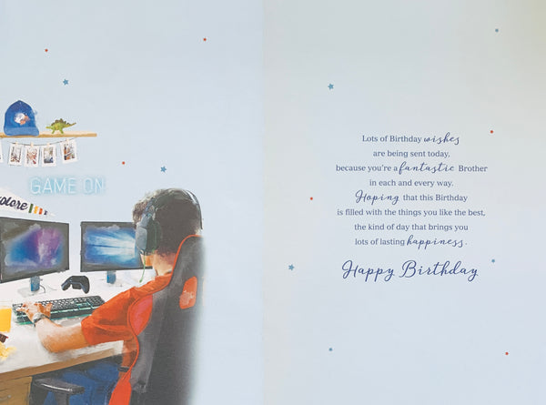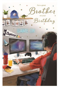 Wish your Brother happy birthday with this traditional gamer themed Brother birthday card. This traditional Brother birthday card is printed on high quality board with a hot foil finish and full colour insert. This Brother birthday card is designed and printed in the UK.