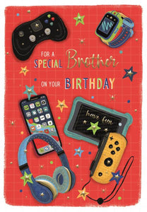 Wish your Brother happy birthday with this Brother birthday card. This Brother birthday card features a bold colourful modern gamer and tech design. This Brother birthday card has a contemporary design and is printed on high quality board with gold foil finish and full colour insert. Fun bright colours. This Brother birthday card is designed and printed in the UK
