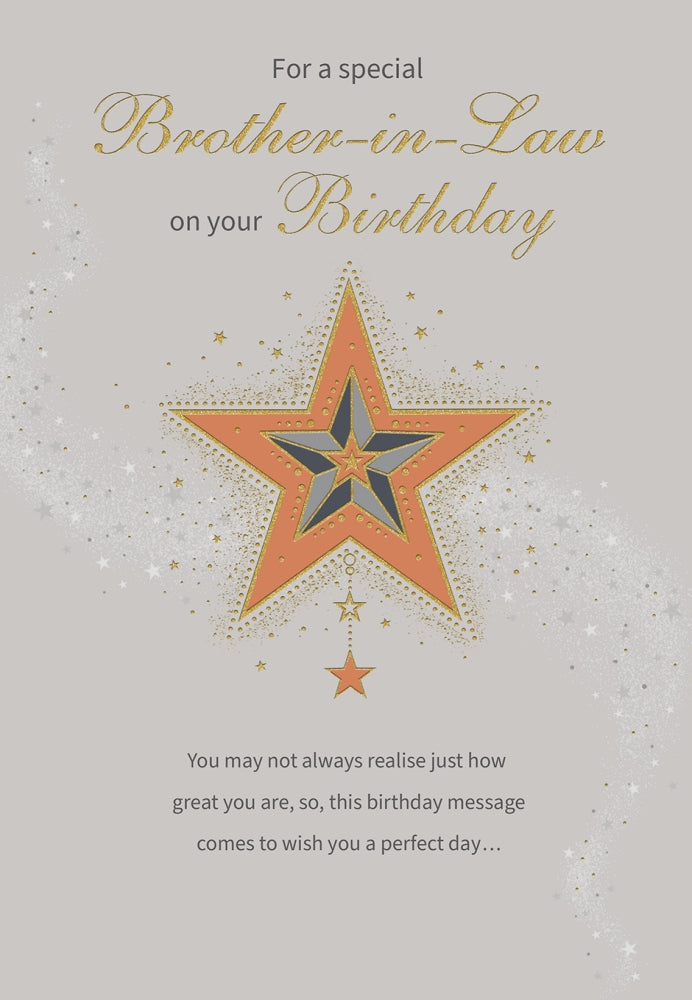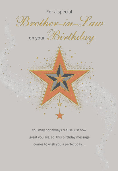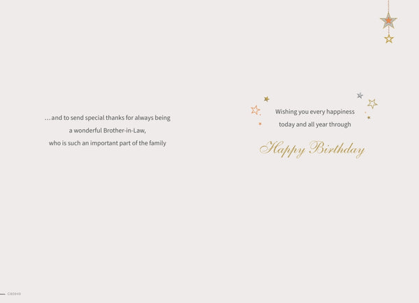 Wish your Brother-in-law happy birthday with this contemporary Brother in law birthday card. This Brother-in-law birthday card features a modern stars design. This Brother-in-law birthday card features a full colour insert with a long hot foil and glitter finish. This Brother-in-law birthday card is designed in the UK.