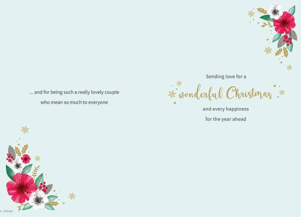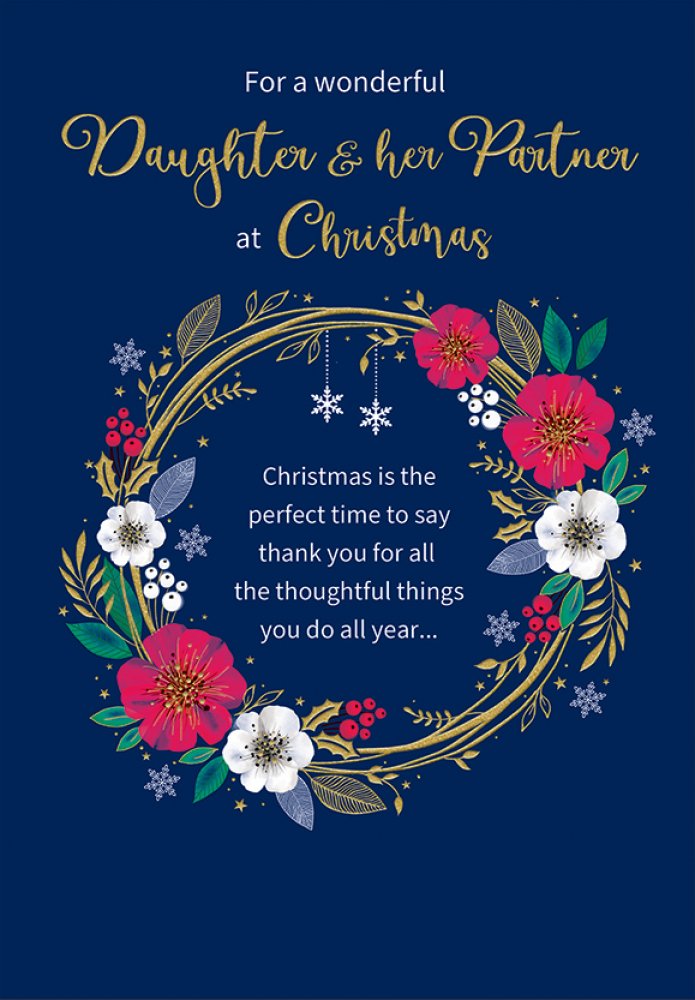 Wish your Daughter and her partner a very merry Christmas and let them know they are being thought about with this traditional Daughter and partner Christmas card. This traditional Daughter and Partner Christmas card features a traditional design. This Daughter and Partner Christmas card has a glitter finish and full colour insert. This greeting card is designed in the UK.