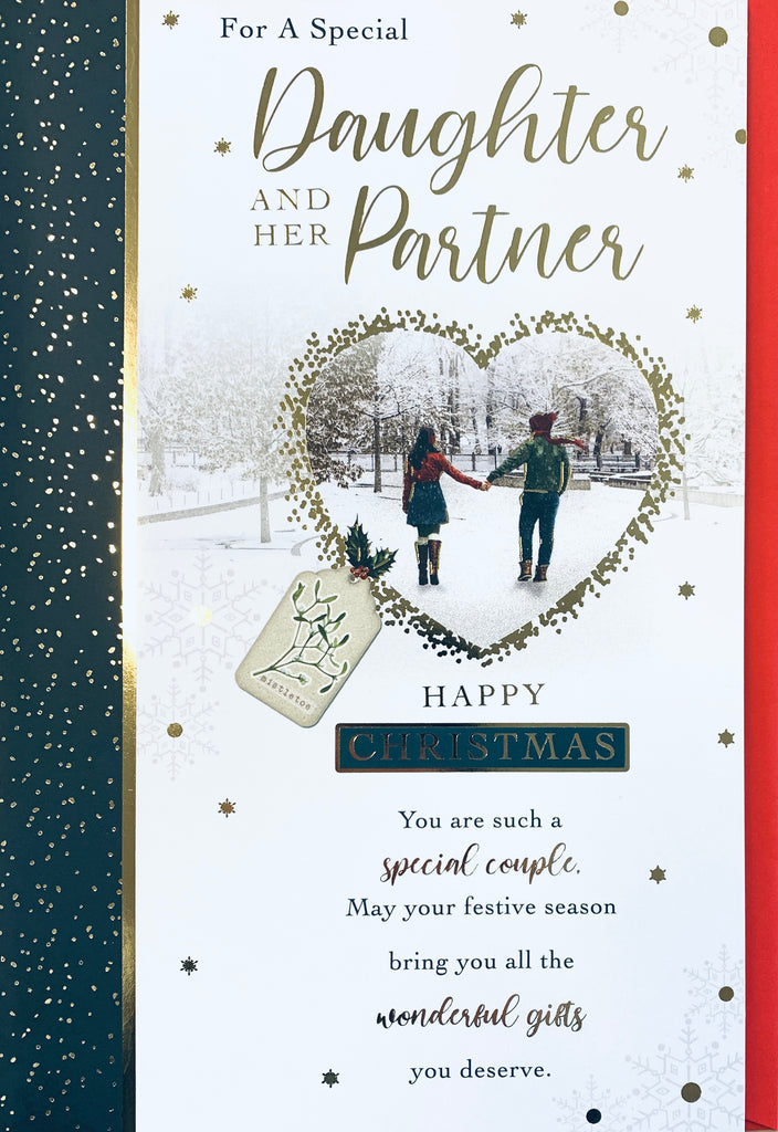 Wish your Daughter and her partner a very merry Christmas and let them know they are being thought about with this contemporary Daughter and partner Christmas card. This contemporary Daughter and Partner Christmas card features a contemporary winter photographic design. This Daughter and Partner Christmas card has a hot foil finish and full colour insert. This greeting card is designed in the UK.