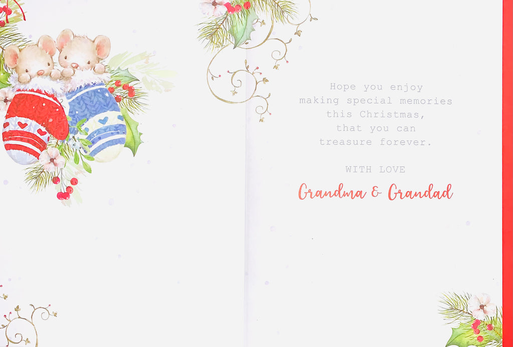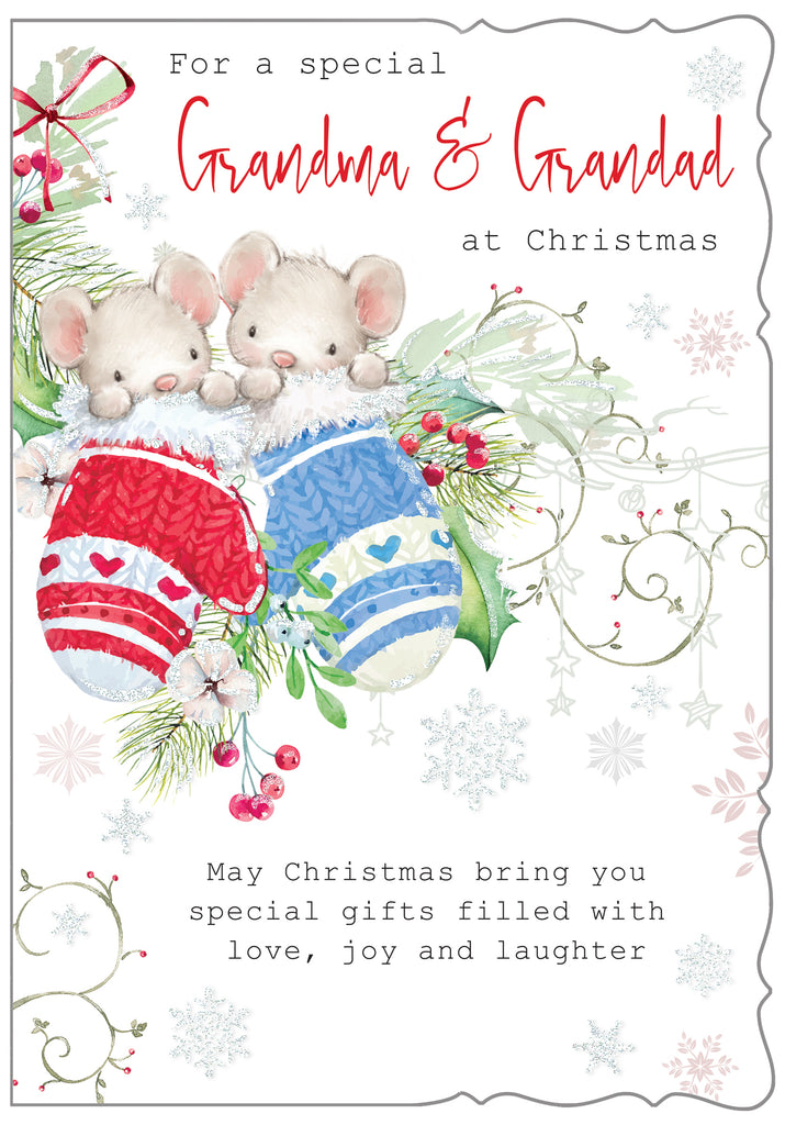 Wish your Grandparents a very merry Christmas with this festive Grandma and Grandad Christmas card. This cute Grandma and Grandad Christmas card features a cute mouse design. This Grandma and Grandad Christmas card has a glitter finish and a full colour insert. This greeting card is designed in the UK.