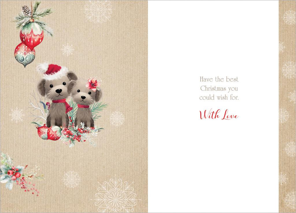 Wish your Son and Daughter-in-law a very merry Christmas and let them know they are being thought about with this cute Son and Daughter-in-law Christmas card. This cute Son and Daughter-in-law Christmas card features a cute Xmas dogs design. This Son and Daughter-in-law Christmas card has a red foil finish and full colour printing inside. This greeting card is designed in the UK.