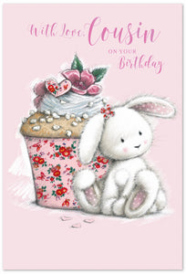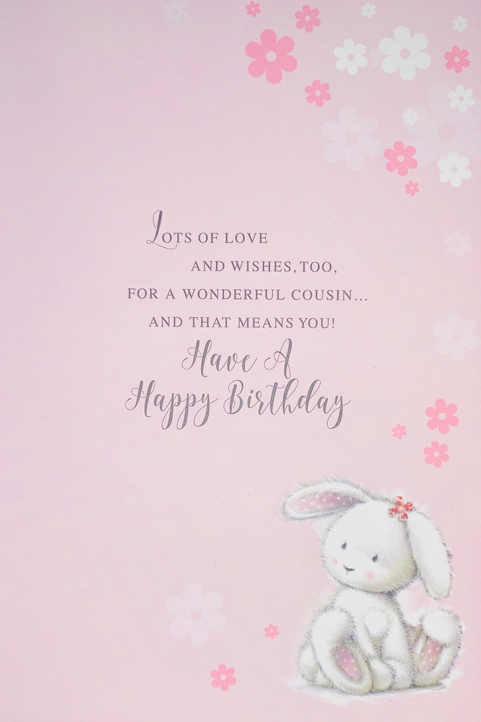 Wish your cousin a wonderful birthday with this cute cousin birthday card. This cousin birthday card features a cute rabbit design with a shiny pink foil finish. This greeting card is designed and printed in the UK.