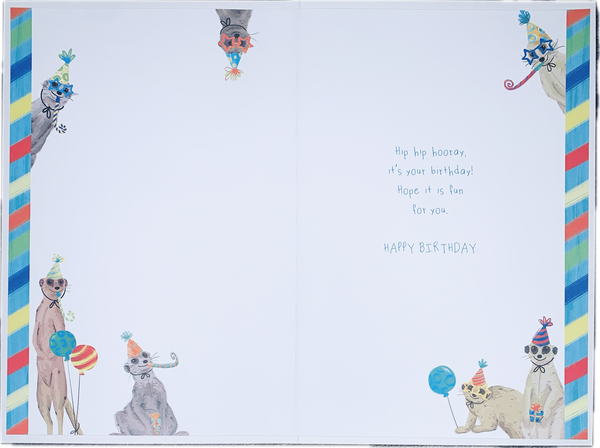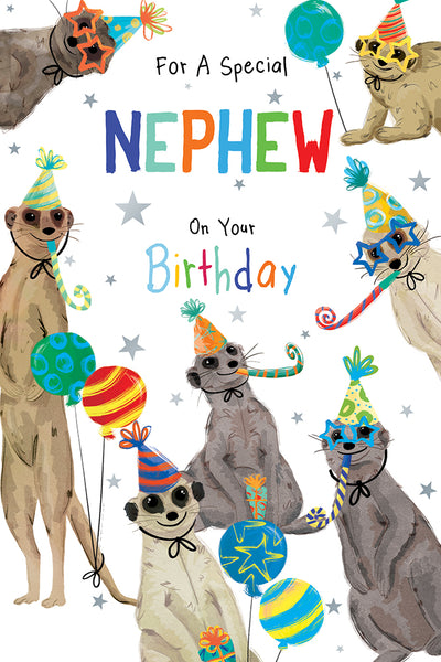 Wish your Nephew an amazing birthday with this Nephew birthday card. This Nephew birthday card features a fun meerkat design with a silver foil finish and full colour insert.