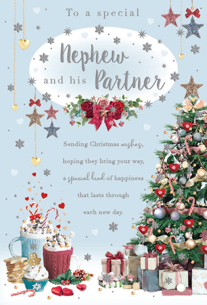 Wish your Nephew and his partner a merry Christmas with this eye catching card featuring a festive Christmas drinks design. Printed on high quality board with a bold golden foil finish, this top-quality UK-made card includes a full-colour insert. Spread the joy this festive season to a special nephew and his partner.