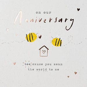 Send your love on your anniversary with this beautiful Our anniversary card! This card boasts a very cute bumble bee design. Our anniversary card is created with superior quality board and features beautiful rose gold foil for a sprinkle of warm loving feelings. This card is crafted and printed in the UK.