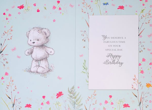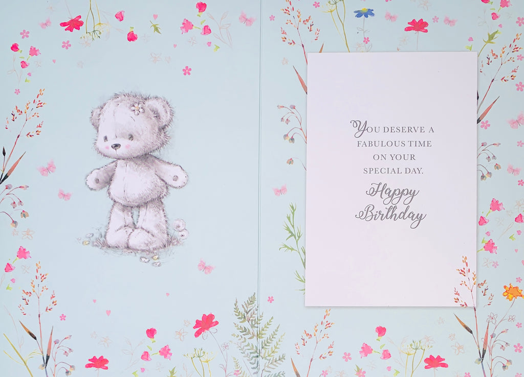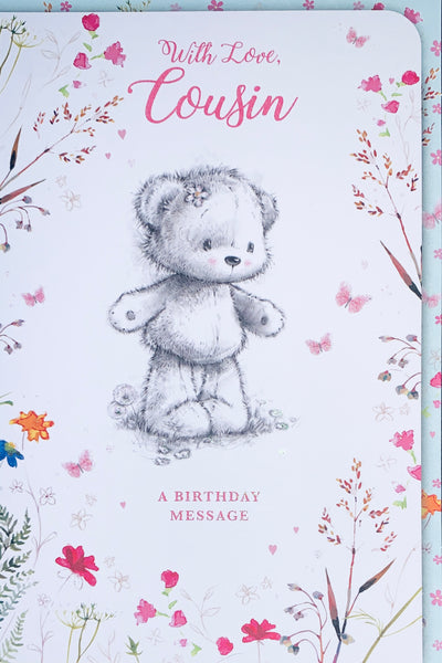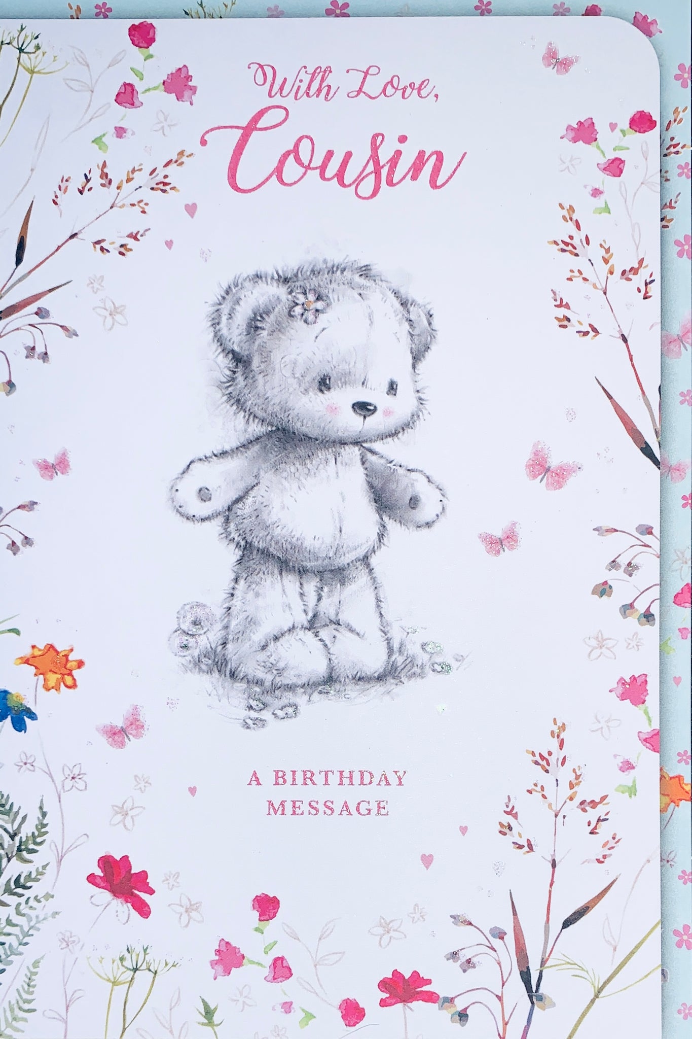 Wish your cousin a wonderful birthday with this cute cousin birthday card. This cousin birthday card features a cute bear design with a sparkling glittet finish. This greeting card is designed and printed in the UK.