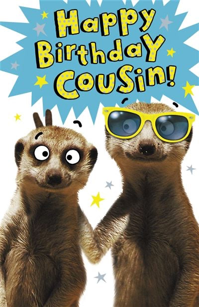 huge grin on your cousins face on their birthday with this funny cousin birthday card. This cousin birthday card features a crazy meerkat design. This green card is printed on high-quality board sourced from environmental responsible sources and it’s designed and made in the UK.