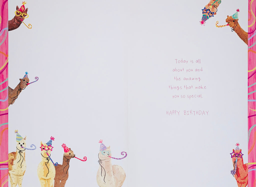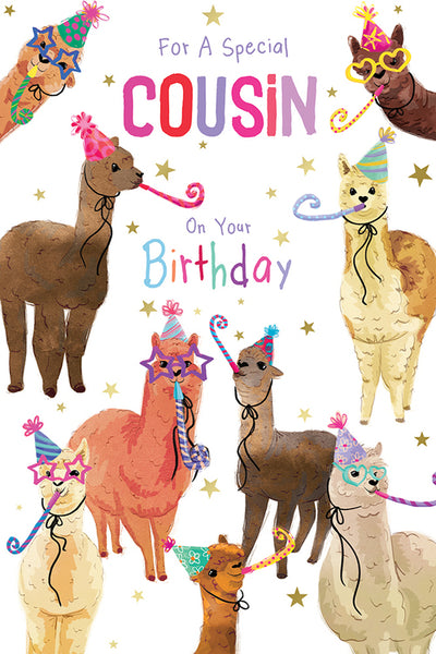 Wish your cousin a fun party filled birthday with this fun and cute cousin birthday card. This cousin birthday card features a fun and colourful party llama design with a golden foil finish and full colour insert.