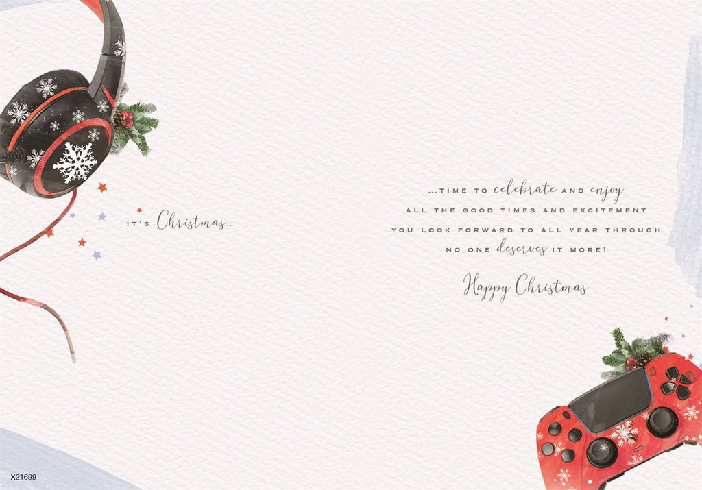 Wish your Cousin merry Christmas with this traditional Cousin Christmas card. This Cousin Christmas card features a Christmas gamer design. This Cousin Christmas card is printed on high quality board with a shimmering gold foil finish and full colour insert. This greeting card is designed and printed in the UK.