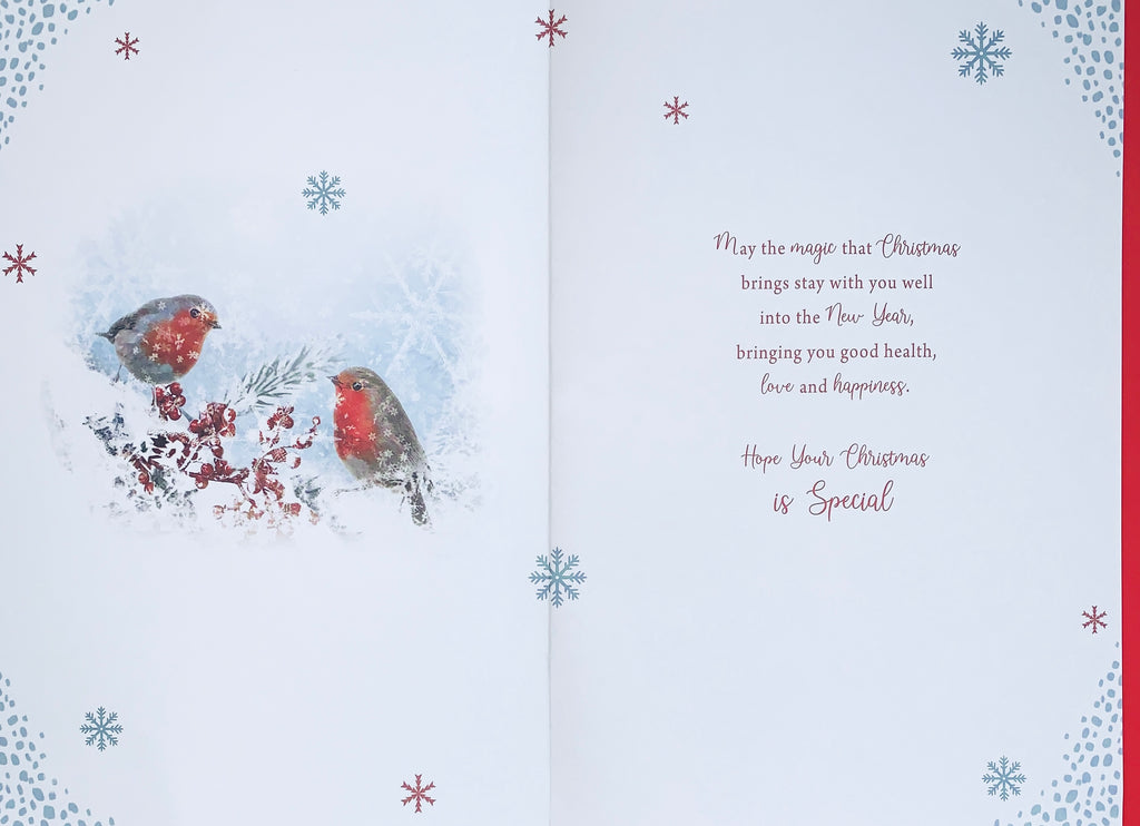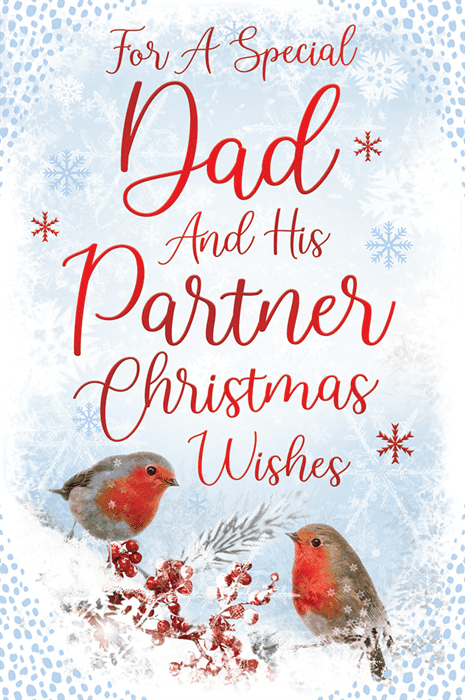 Wish your Dad and his partner a very merry Christmas and let them know they are being thought about with this traditional Dad and partner Christmas card. This traditional Dad and Partner Christmas card features a winter robin design. This Dad and his Partner Christmas card has a hot foil finish and full colour insert. This greeting card is designed in the UK.