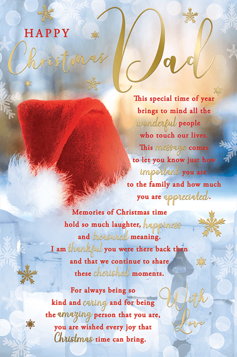 Wish your Dad a very merry Christmas and let him know he is loved with this traditional Dad Christmas card. This Dad Xmas card features a traditional festive design. Inside this Dad Christmas card is a full colour insert. This Dad Christmas card features a hot foil finish and is designed in the UK.