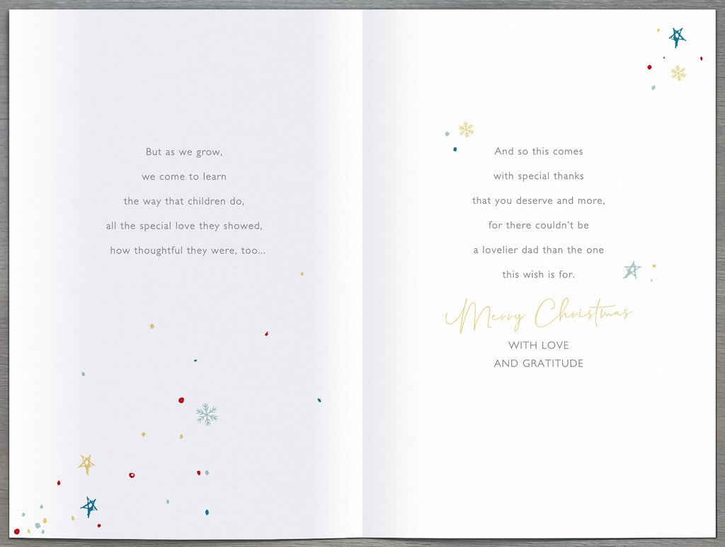 Verse reads: until we’re grown we never know I fully realise, how good to us our parents are, how gentle and how wise. But as we grow, we come to learn the way that children do, all the special love they showed, how thoughtful they were, too. And so this comes with special things that you deserve and more, but there couldn’t be a lovely dad than the one this wish is for. Merry Christmas. With love and gratitude.