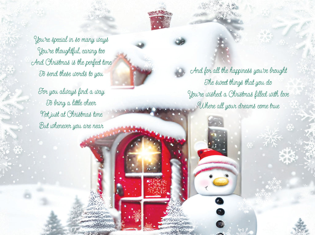 Verse reads: At Christmas time dear Dad, when the north wind starts to blow you’re thought of with a smile and such a warming glow. You’re special in so many ways, you’re thoughtful, caring too. And Christmas is the perfect time to send these words to you. For you always find a way to bring a Little cheer, not just at Christmas time but whenever you are near. And for all the happiness you’ve brought, the sweet things that you do, you’re wished a Christmas filled with love where all your dreams come true.