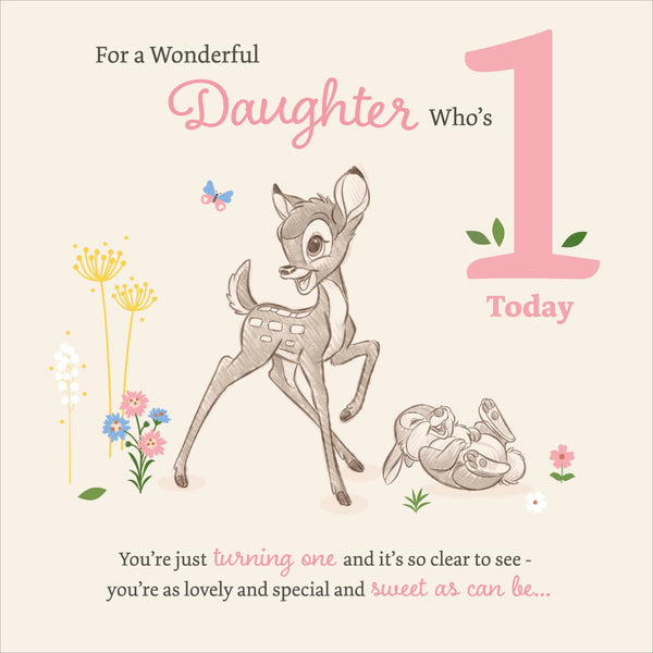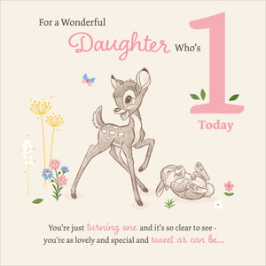 Celebrate a wonderful first birthday for your daughter with this cute Daughter 1st birthday card. This daughter first birthday card features a cute Disney Bambi design and is printed on high quality board with a holographic foil finish. This Daughter first birthday greeting card has a full colour multi page insert. Medium length verse.