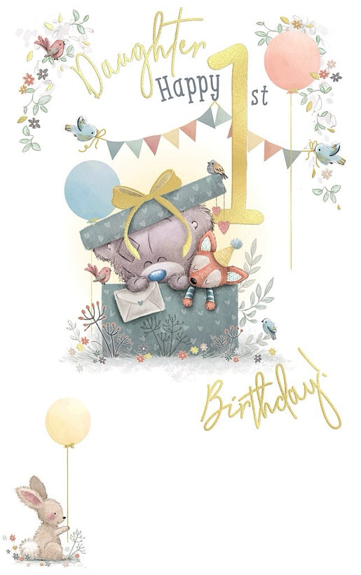 Celebrate your Daughter’s first birthday with this me to you daughter’s first birthday card. This Daughter’s first birthday card features a cute tatty teddy design. This cute Daughter’s first birthday card has a golden foil finish and full colour print inside. This Daughter’s first birthday card is printed on high quality board sourced from environmentally responsible sources.