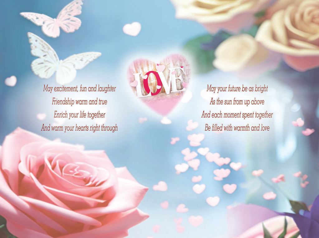 Verse reads: You’ve got engaged, how wonderful. May your dreams and wishes too come true to bring such happiness to the both of you. May excitement, fun and laughter, friendship warm and true enrich your life together and warm your hearts right through. May your future be as bright as the sun from up above, and each moment spent together be filled with warmth and love.