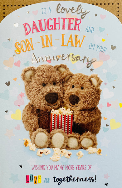 Wish your Daughter and Son-in-law happy anniversary with this cute Daughter and Son-in-law anniversary card. This cute Daughter and Son-in-law anniversary card features a cute bear design. This Daughter and Son-in-law anniversary card is printed on high quality board with a hot foil finish and full colour print inside. Short verse. This greeting card is designed and printed in the UK.