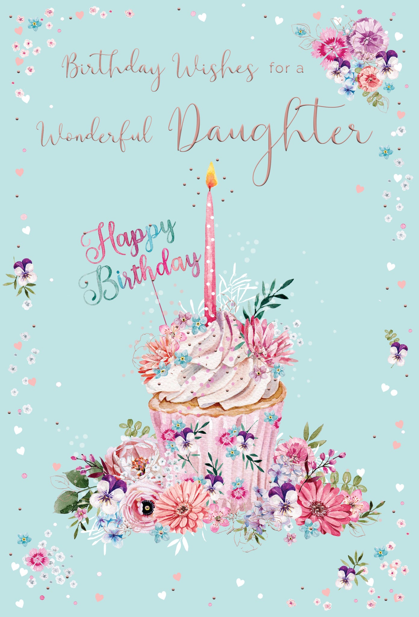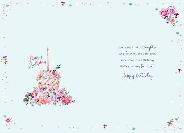 Wish your Daughter a wonderful birthday with this beautiful Daughter birthday card. This birthday card for Daughter features a gorgeous cupcake and flowers design. This greeting card is printed on high quality board with a hot foil finish. This Daughter birthday card has a full colour insert with a medium length verse. This greeting card is designed and printed in the UK.