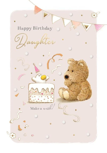 Send loving birthday wishes to your daughter with this very cute birthday card for daughter. This daughter birthday card features a cute bear design. This daughter birthday card is printed on high quality board with a gold foil finish. This greeting card has a full colour insert and is designed and printed in the UK. This daughter birthday card is made from environmentally responsible resources.
