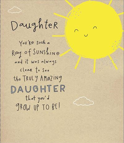 Let your Daughter know how special she is with this lovely Daughter birthday card. Wish your Daughter happy birthday and let her know how you lucky feel to have her in your life with this lovely birthday card for Daughter. This lovely Daughter birthday card features a cute sunshine design. This birthday card for Daughter is printed on high quality board. This greeting card is designed and printed in the UK and is made using environmentally responsible sourced card.