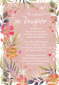 | Verse: | For a special Daughter You mean more Than you could even guess, You fill life with so much love, Laughter and happiness. Beautiful baby girl To the person you are today, You’ve brought pride with all the steps You’ve taken along the way. Your energy and strength Shine through for anyone to see, That you face everything life brings With so much positivity. Through all the little ups and downs There has never been a doubt, That you’re a wonderful example Of what having a Daughter is all about. So your Birthday is the perfect time To say what’s always true, There couldn’t be a Daughter Who is loved as much as you! Happy Birthday |