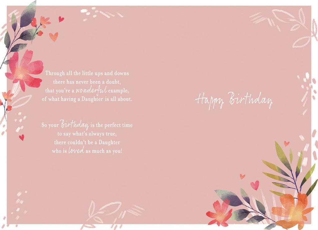 Wish your Daughter happy birthday with this beautiful Daughter birthday card. This greeting card is printed on high quality board with an eye catching rose gold foil finish and full colour insert. This Daughter birthday card features a beautiful floral design with a long sentimental verse to express your love and pride for your daughter. This greeting card is designed and printed in the UK on board sourced from environmentally responsible resources.