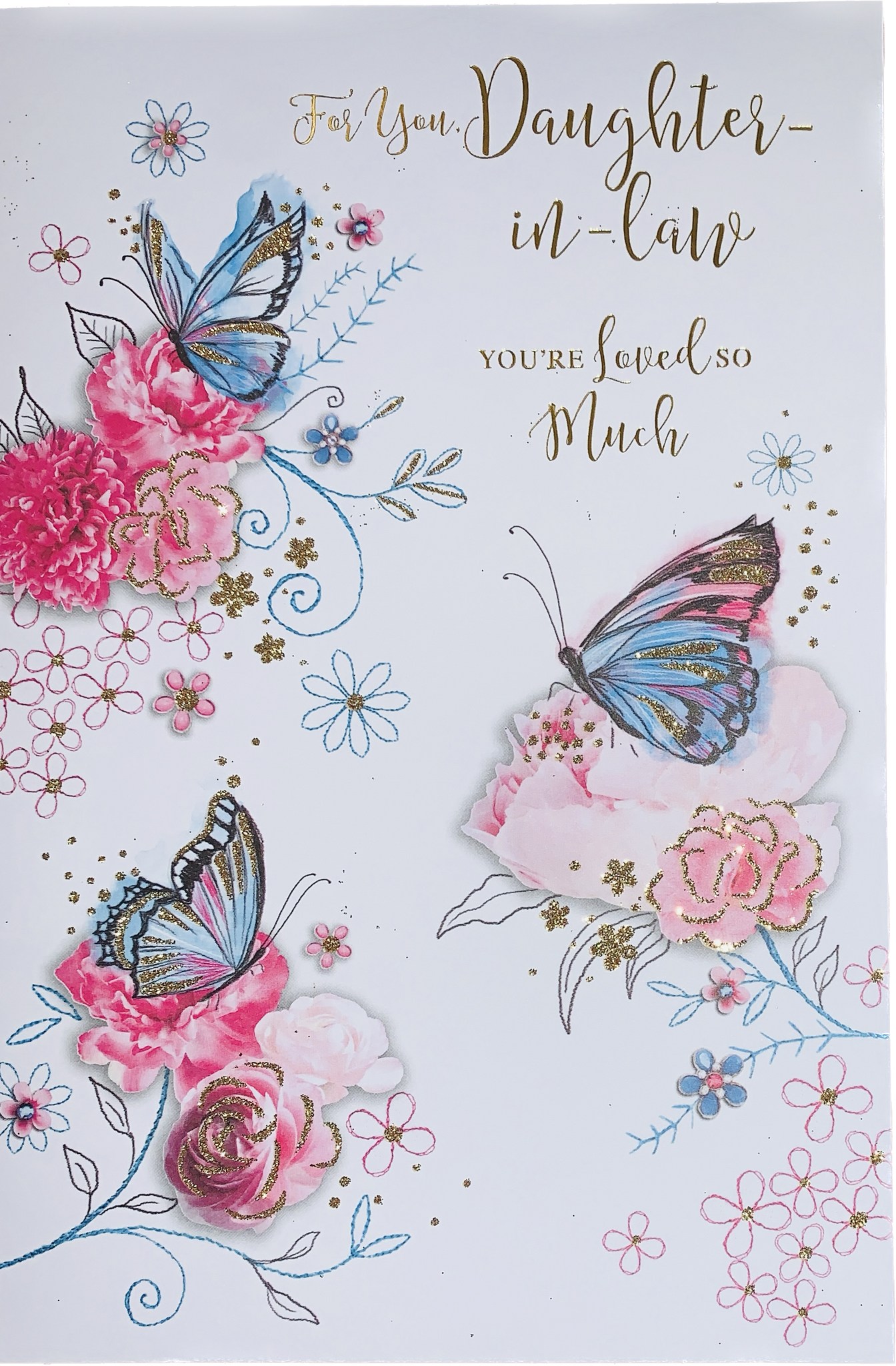 Send lovely happy birthday wishes to your Daughter-in-law with this traditional Daughter in law birthday card. This Daughter in law birthday card features a pretty flowers and butterflies design. This birthday card for Daughter-in-law has a hot foil and glitter finish. This greeting card has full colour print inside.