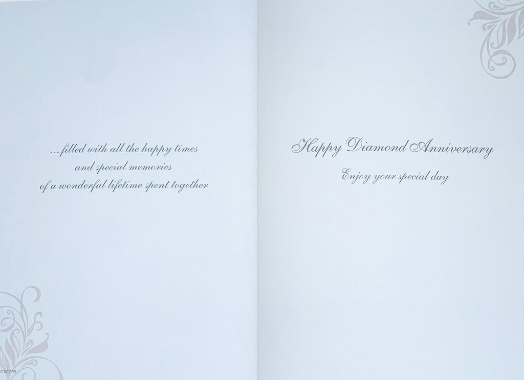 Help them celebrate this remarkable landmark anniversary with this diamond wedding anniversary card. This 60th anniversary card features a heart themed design. This diamond wedding anniversary card features a bright hot foil finish with a full colour insert. This 60th wedding anniversary greeting card is designed and produced in the UK.