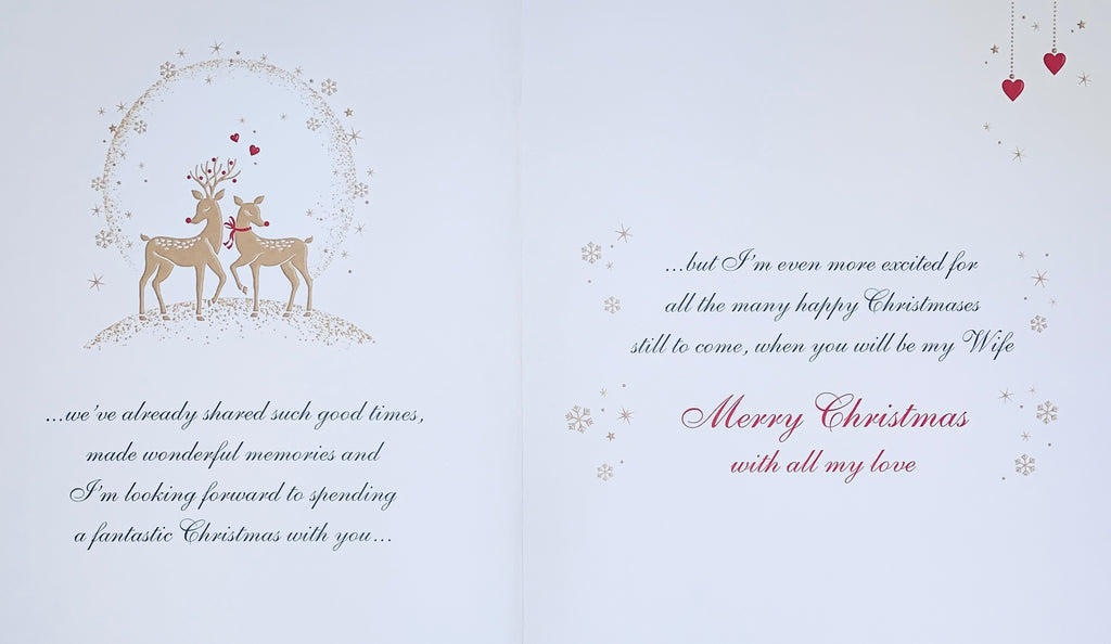 Wish your Fiancée a wonderful Christmas and let them know how special they are with this lovely Fiancée Christmas card. This Fiancée Christmas card features a beautiful loving reindeer design with a bold hot foil and glitter finish with a full colour insert. This greeting card is designed in the UK.