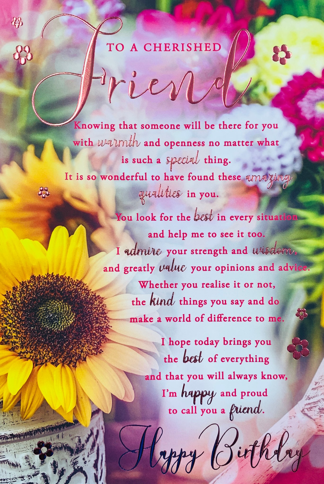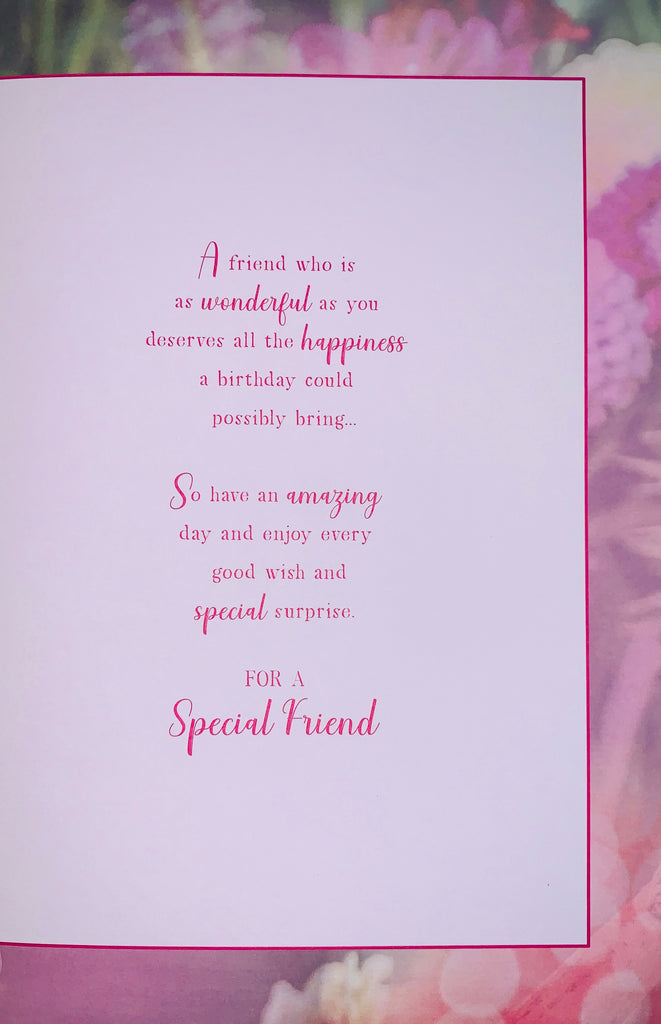 Let your friend know how special they are with this sentimental friend birthday card. This friend birthday card features a lovely floral themed photographic design. Inside this friend birthday card is a full colour insert with a long sentimental verse. This friend birthday card features a hot foil finish and is designed in the UK.
