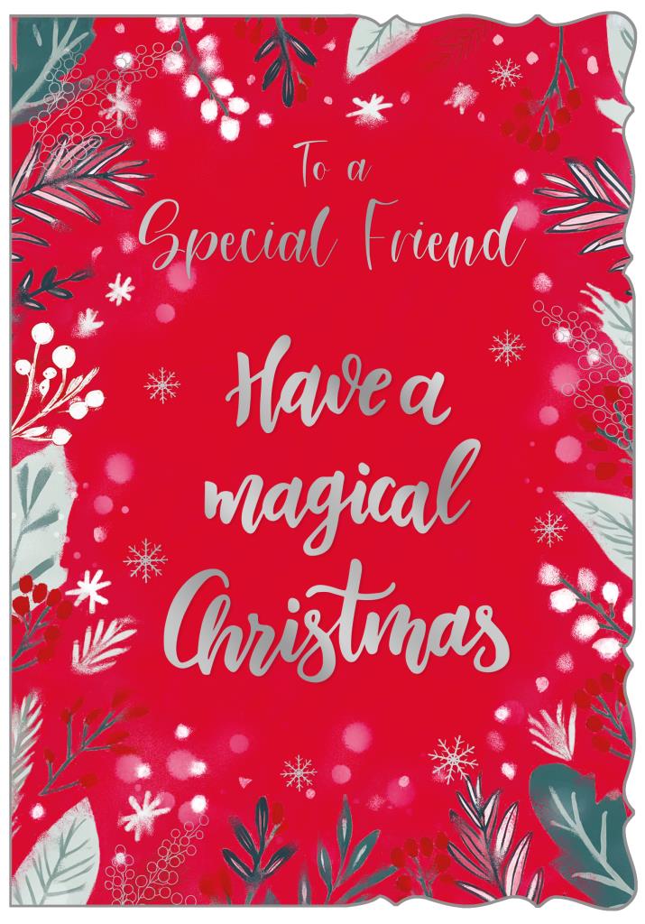 Wish your friend a wonderful Christmas with this traditional friend Christmas card. This friend Christmas card features a classic floral design with a silver foil finish and full colour print inside. This greeting card is designed in the UK.