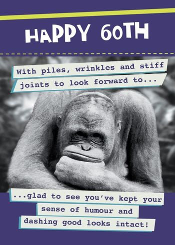 Send a chuckle to the 60 year old with this amusing 60th birthday card. Wish them a great sixtieth birthday and remind them what they have to look forward to, with this funny card. Printed in the UK on high quality environmentally sourced board because even old people want to protect the planet