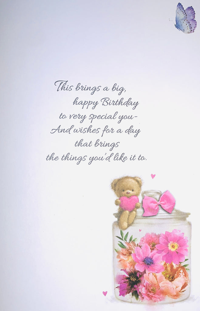 Wish her a wonderful birthday with this general birthday card for her. This birthday card for her features a cute bear sitting on a jar of flowers design. This greeting card has a hot foil and glitter finish. This greeting card has a full colour insert.