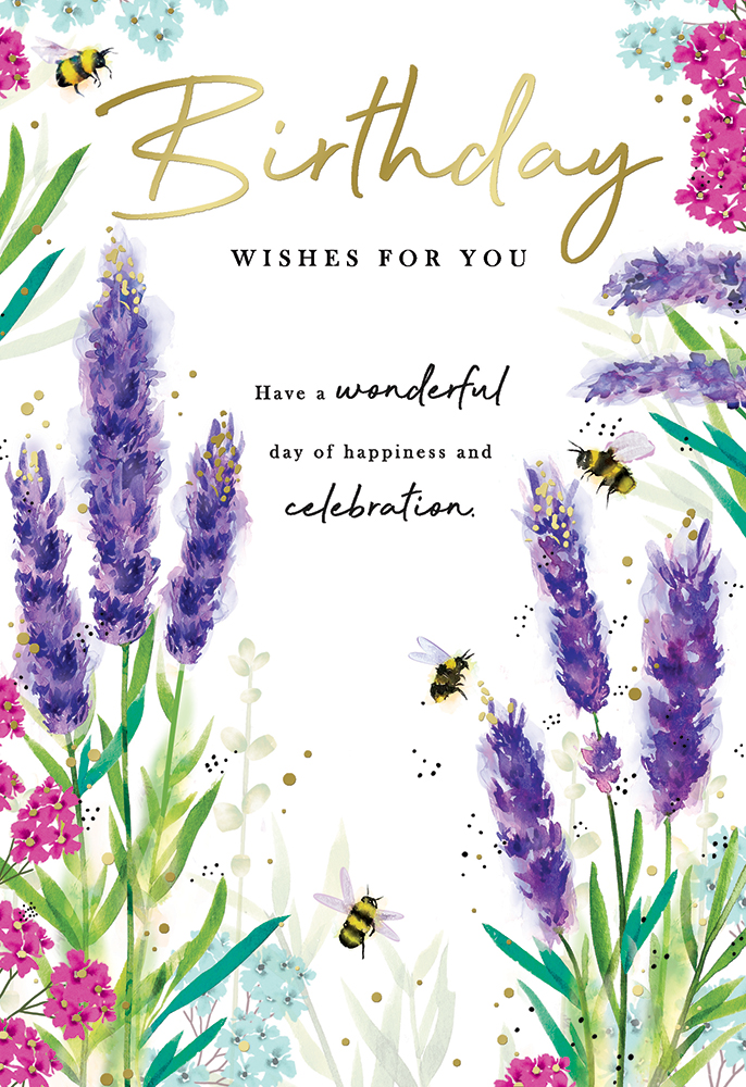 Wish her happy birthday with this birthday card for her. This general birthday card for her features a beautiful purple floral design. Inside this birthday card for her is a full colour insert. This greeting card features a hot foil finish and is designed and printed in the UK.